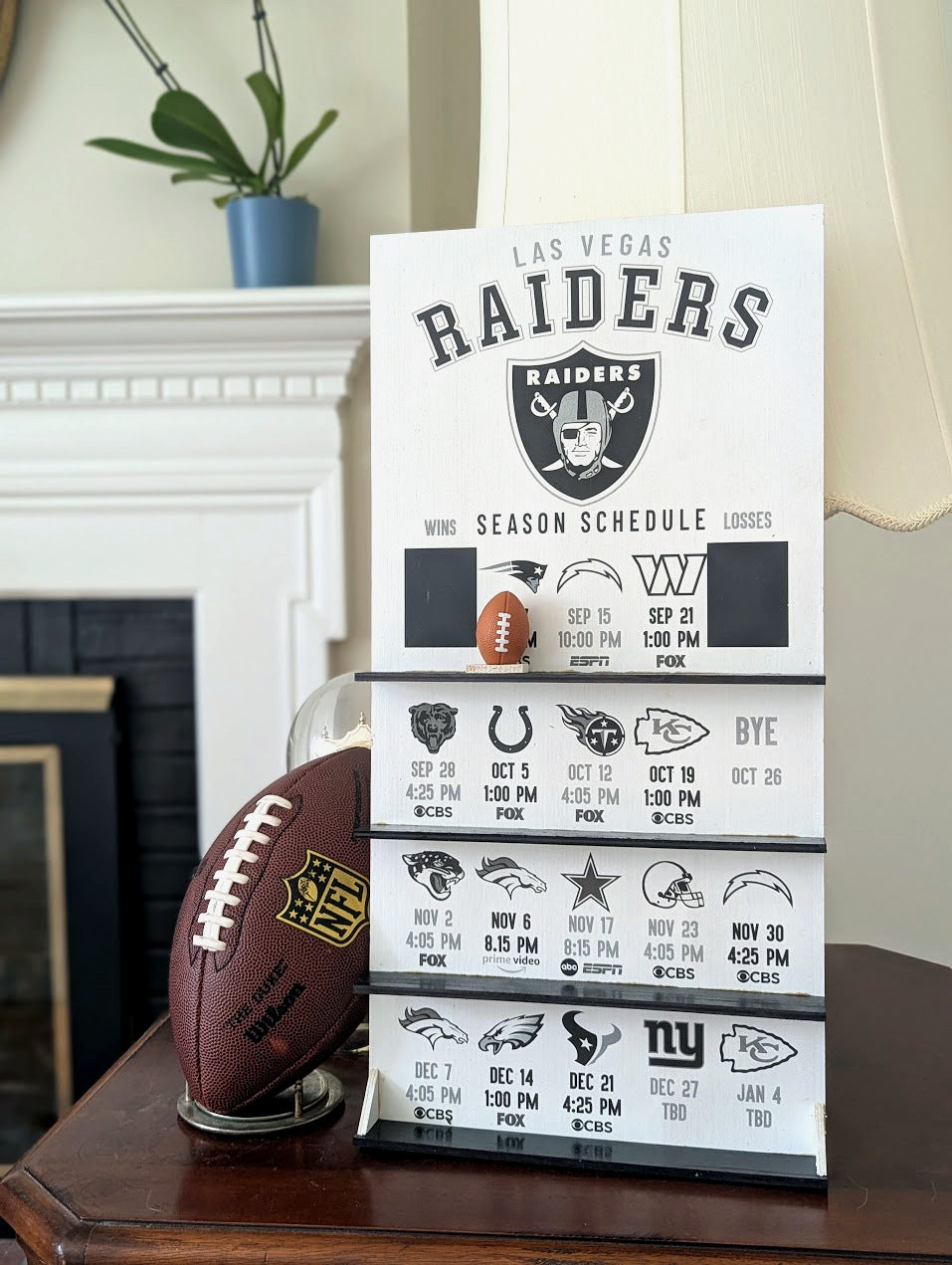 Show your team pride with this handcrafted wooden football schedule for the Las Vegas Raiders' 2024 season.