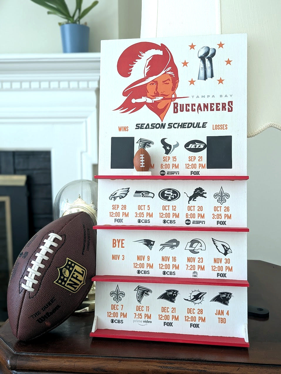 Show your team pride with this handcrafted wooden football schedule for the Tampa Bay Buccaneers season.