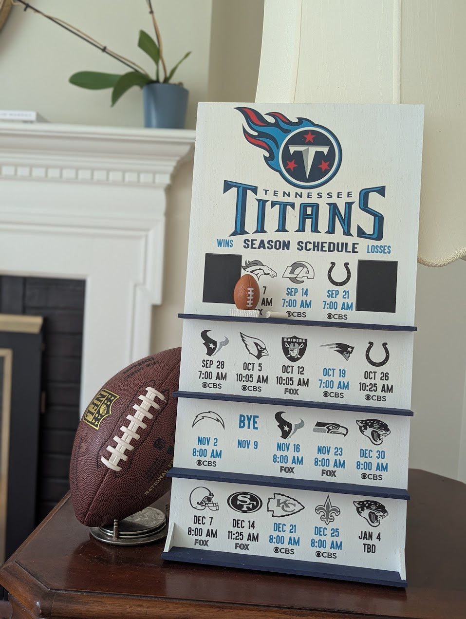 Show your team pride with this handcrafted wooden football schedule for the Tennessee Titans' season.